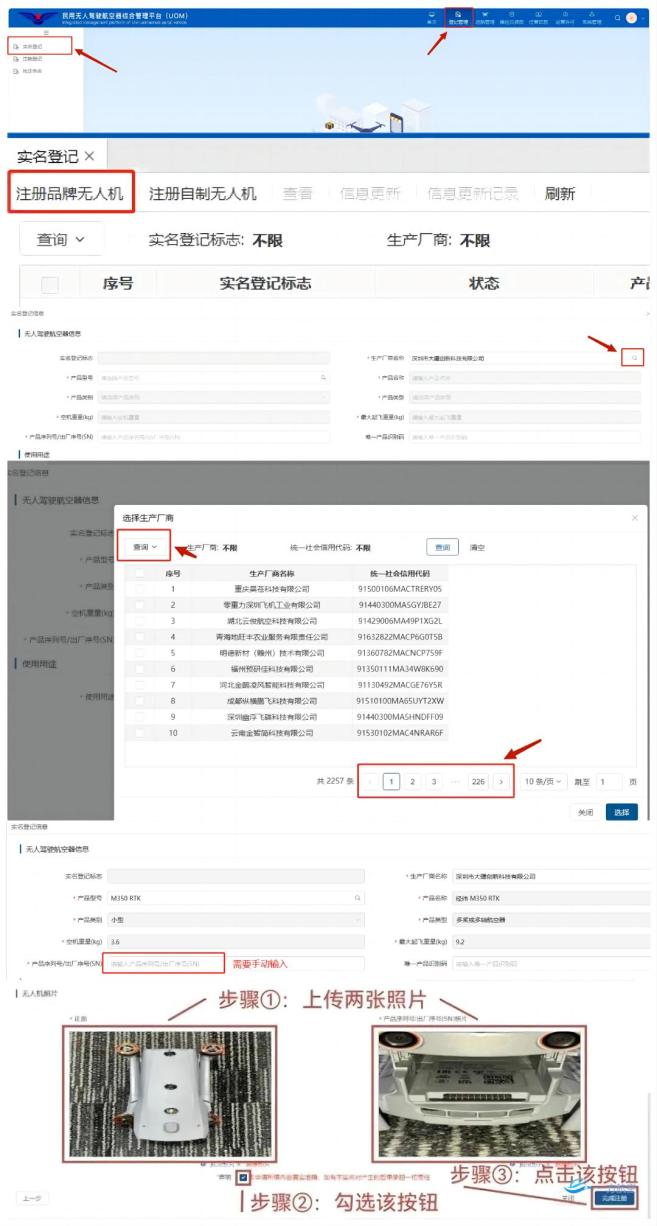登錄好進(jìn)入首頁——點擊右上角登記管理——實名登記——注冊品牌無人機——驗證所有人信息——手機掃碼刷臉驗證——選擇生產(chǎn)商名稱(可一頁頁看,也可直接輸入搜索)——選擇型號等相關(guān)信息(序列號需手動輸入)——根據(jù)要求長傳照片——完成注冊。